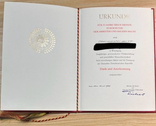 DDR Volkspolizei Urkunde für 35 Jahre Treue Dienste, Obermeister der VP.