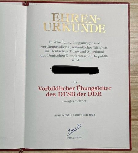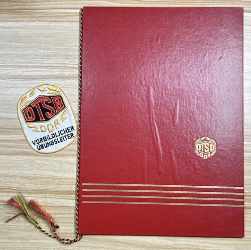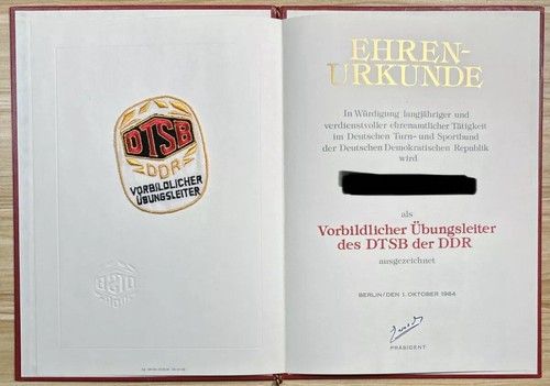 DDR Urkunde Vorbildlicher Übungsleiter DTSB mit Stoffabzeichen. Original DDR Orden/Abzeichen Zustand: gute Erhaltung, Mappe hat leichte wellen