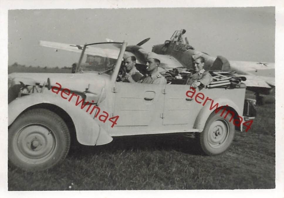 Deutsche Soldaten Kübelwagen mit Tatra 57 k am Flugzeug Me Bf 110 Griechenland