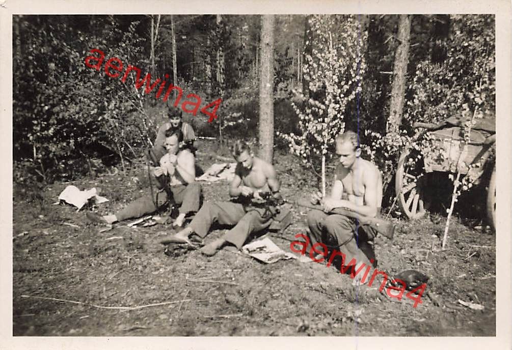 Deutsche Soldaten Waffenreinigung im Wald mit getarnten Geschütz