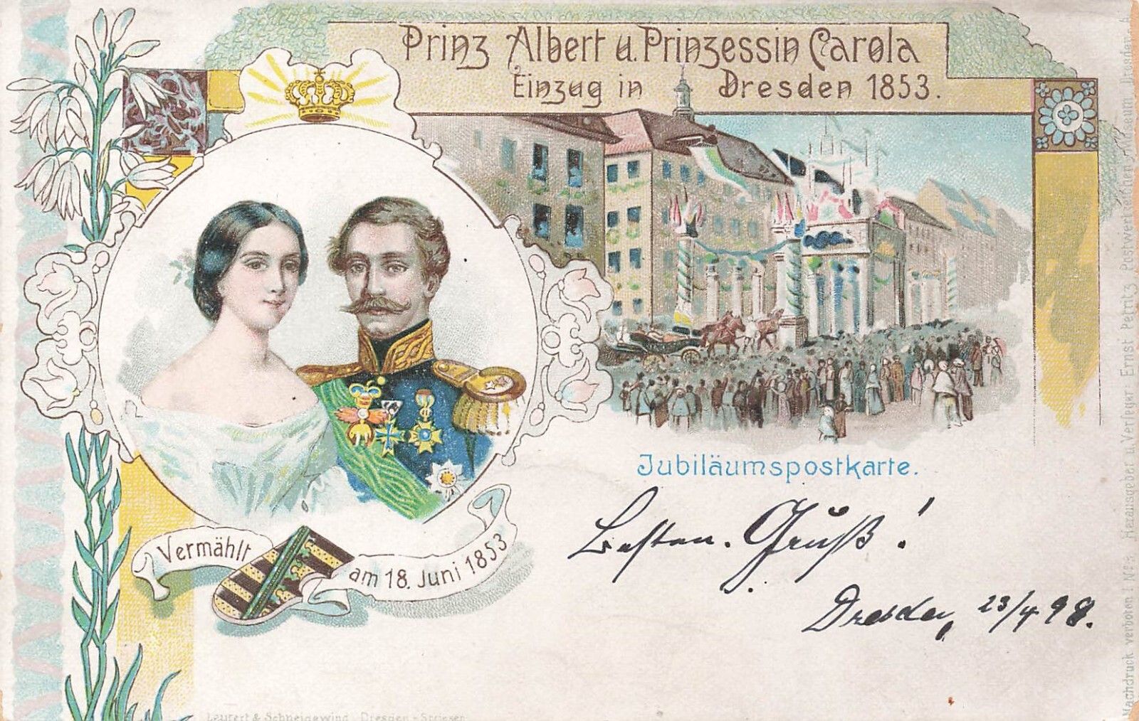 Einzug in Dresden Portrait Prinz Albert und Prinzessin Carola Postkarte AK 1898