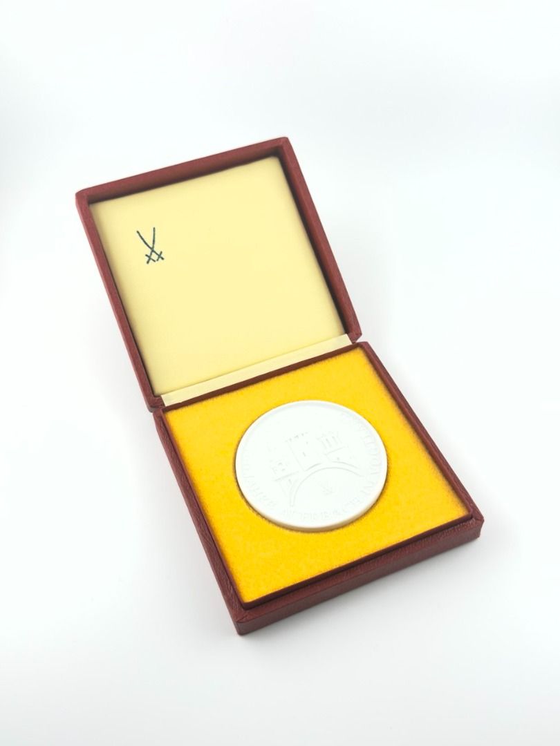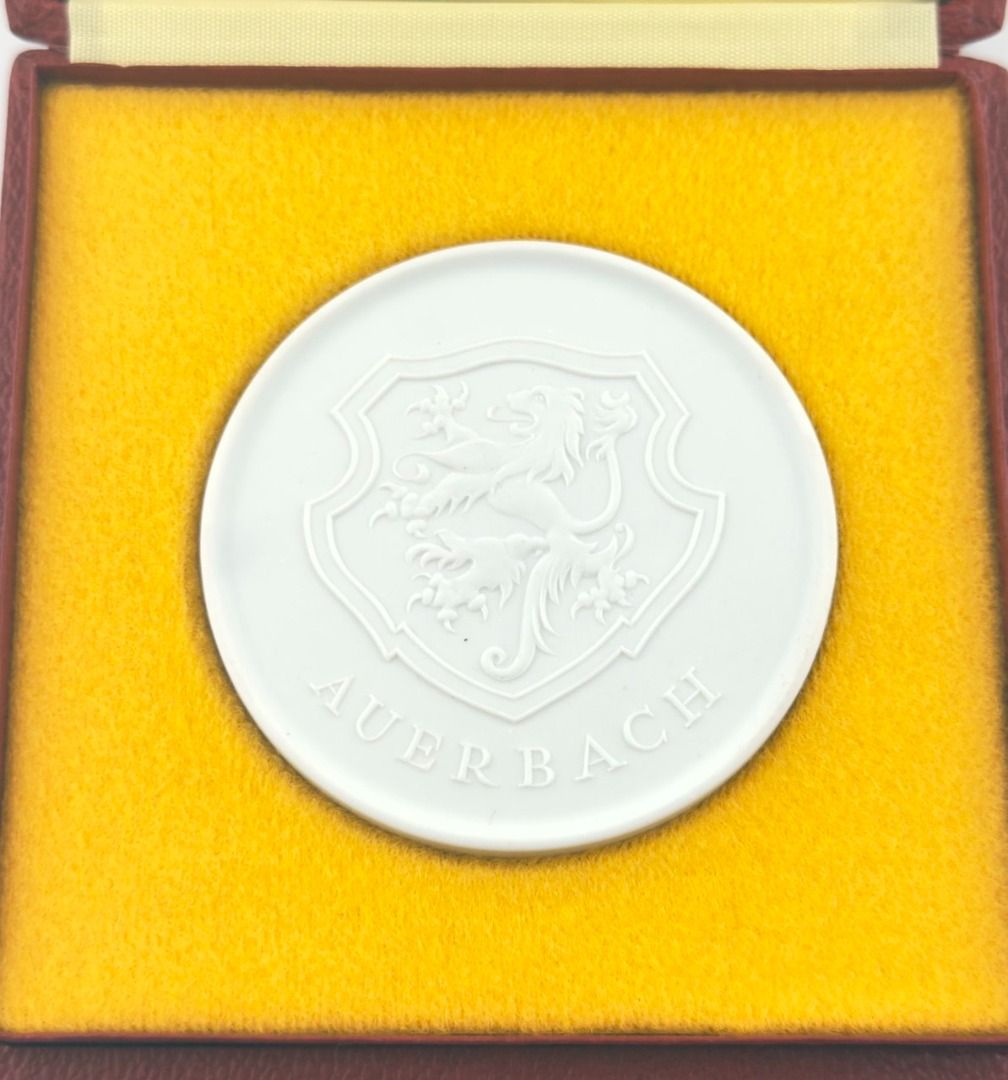 DDR Meissner Porzellan Medaille 700 Jahre Auerbach 1282-1982 weiß mit Etui