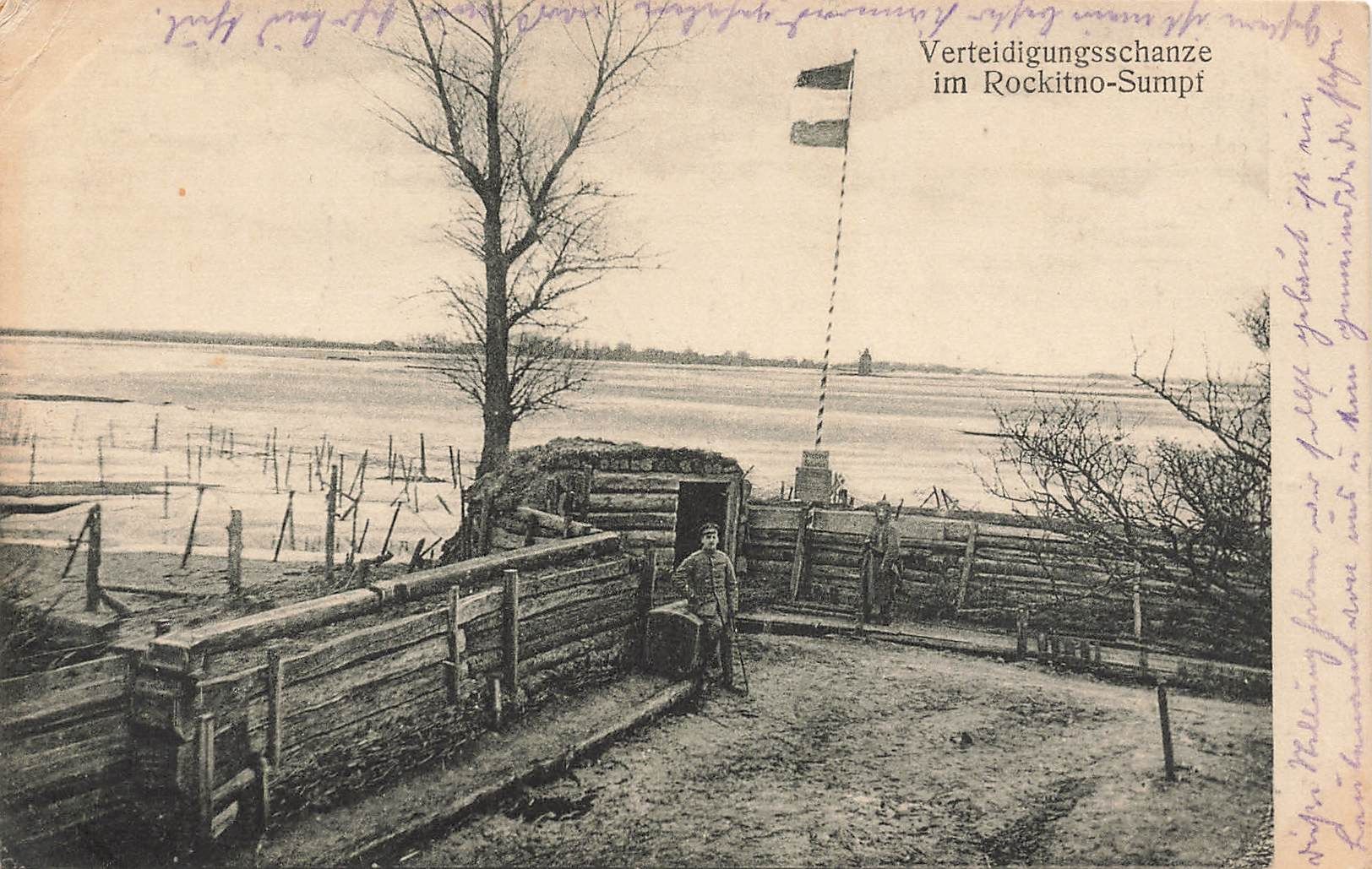 Fotokarte 1.WK Soldat Verteidigungsschanze im Rockitno-Sumpf bei Minsk
