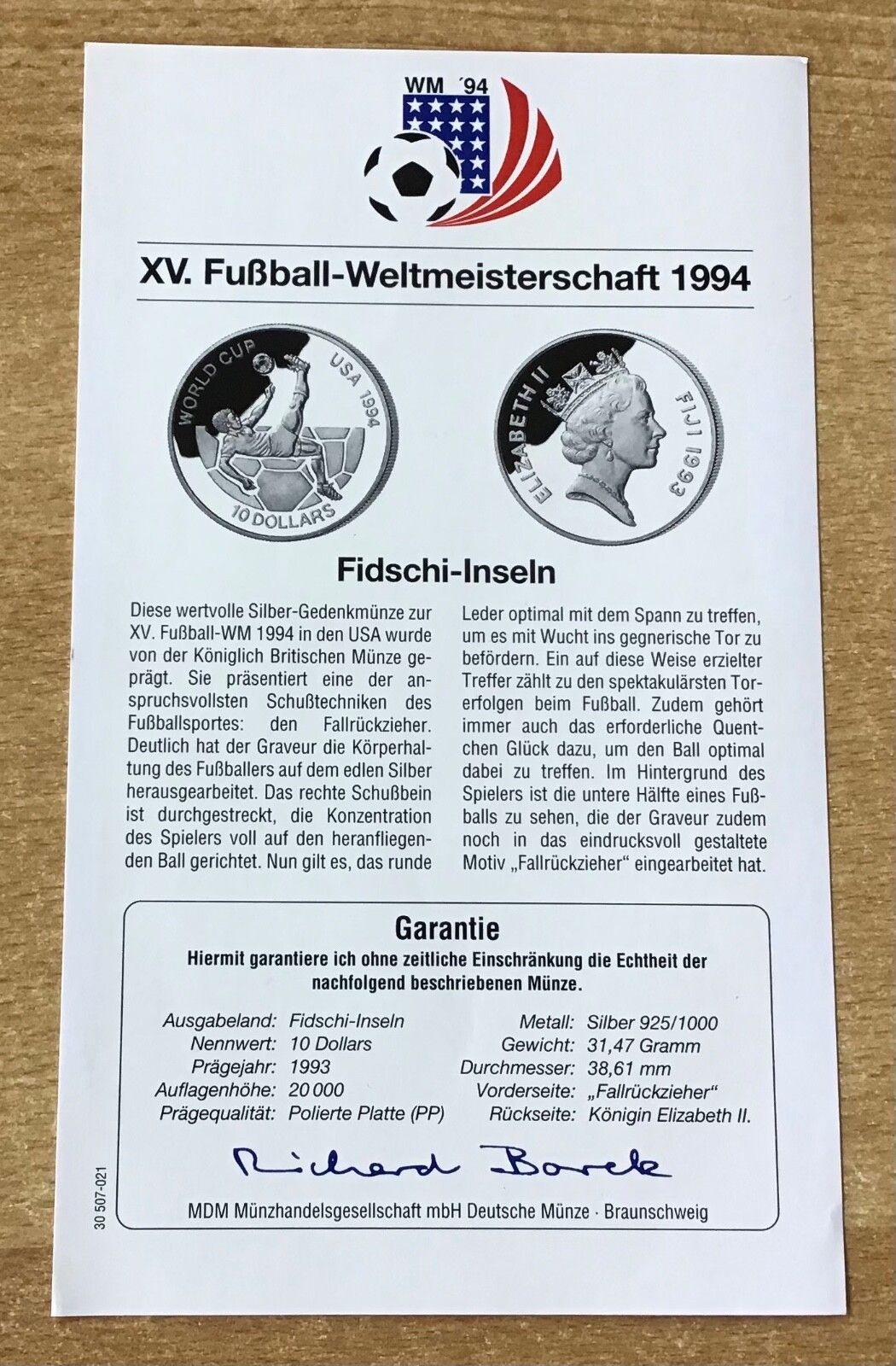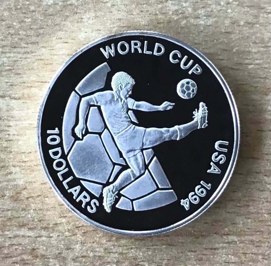 Fidschi - Insel 10 Dollars 1993 Fallrückzieher Fußball PP Silbermünze Zertifikat