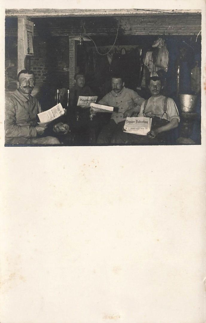 Fotokarte 1.WK Deutsche Soldaten Zeitung lesen Leipziger Volkszeitung im Bunker