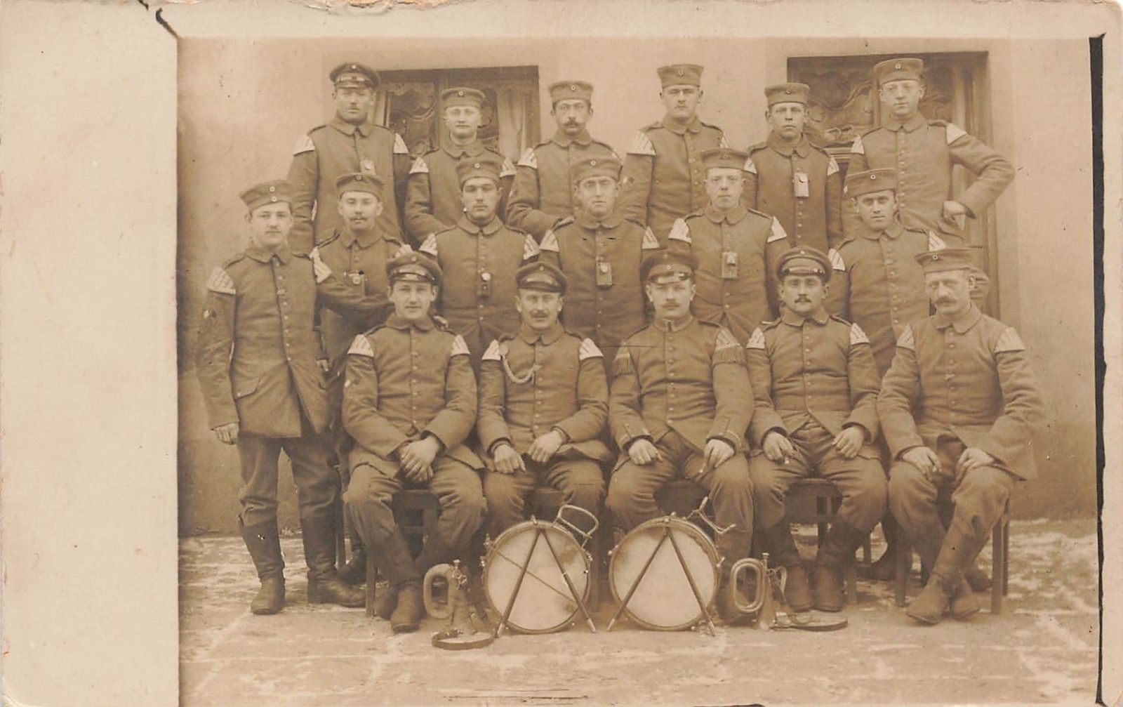 Fotokarte 1.WK Gruppenfoto Soldaten Militärmusiker Spielmannszug