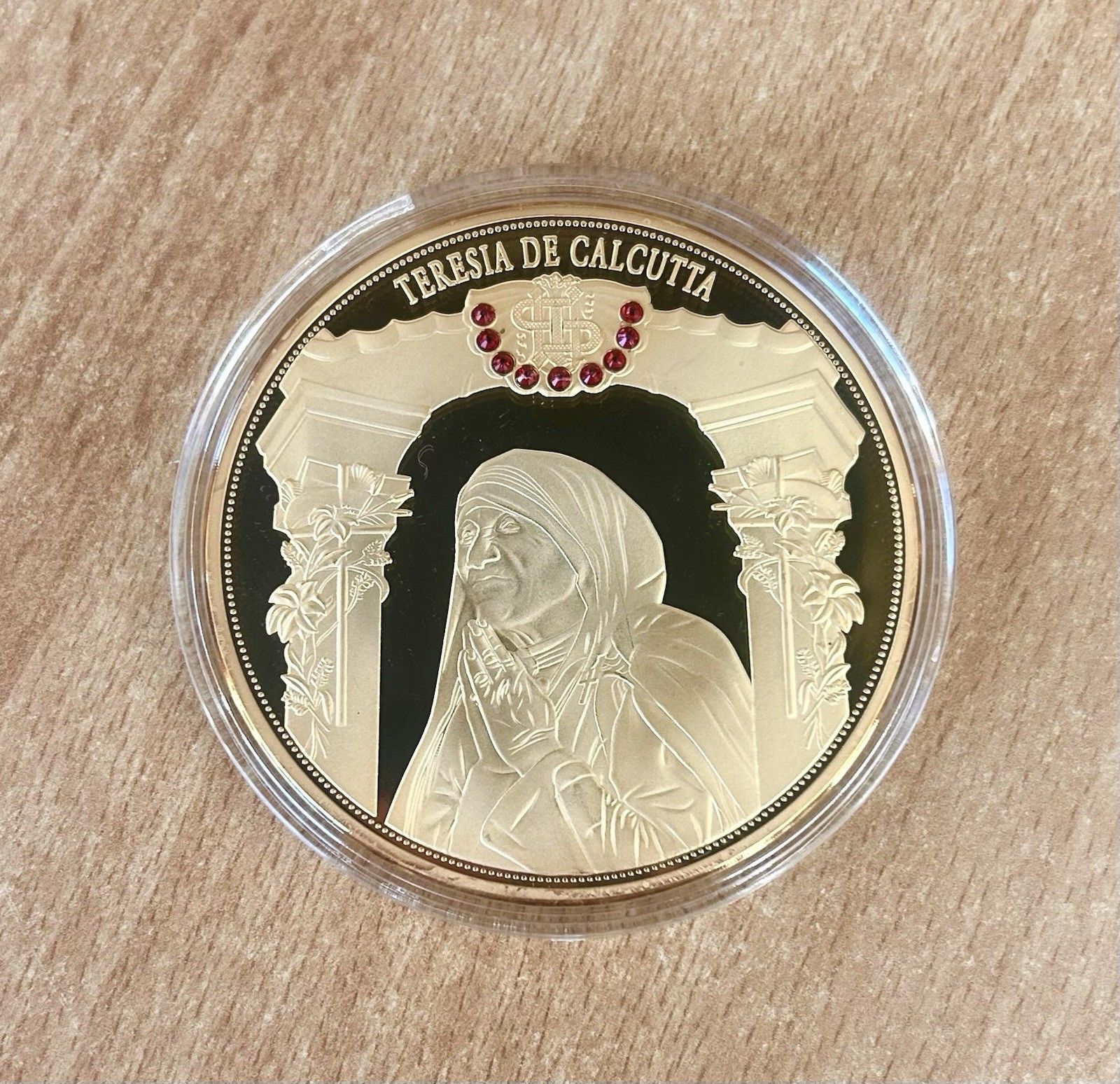 Gedenkmedaille Heiligen Teresa von Kalkutta Vergoldet mit Swarovskis PP 2016 Material: cu / vergoldet 9999 Gewicht: 110g Durchmesser: 70mm Zustand siehe Original Bildern