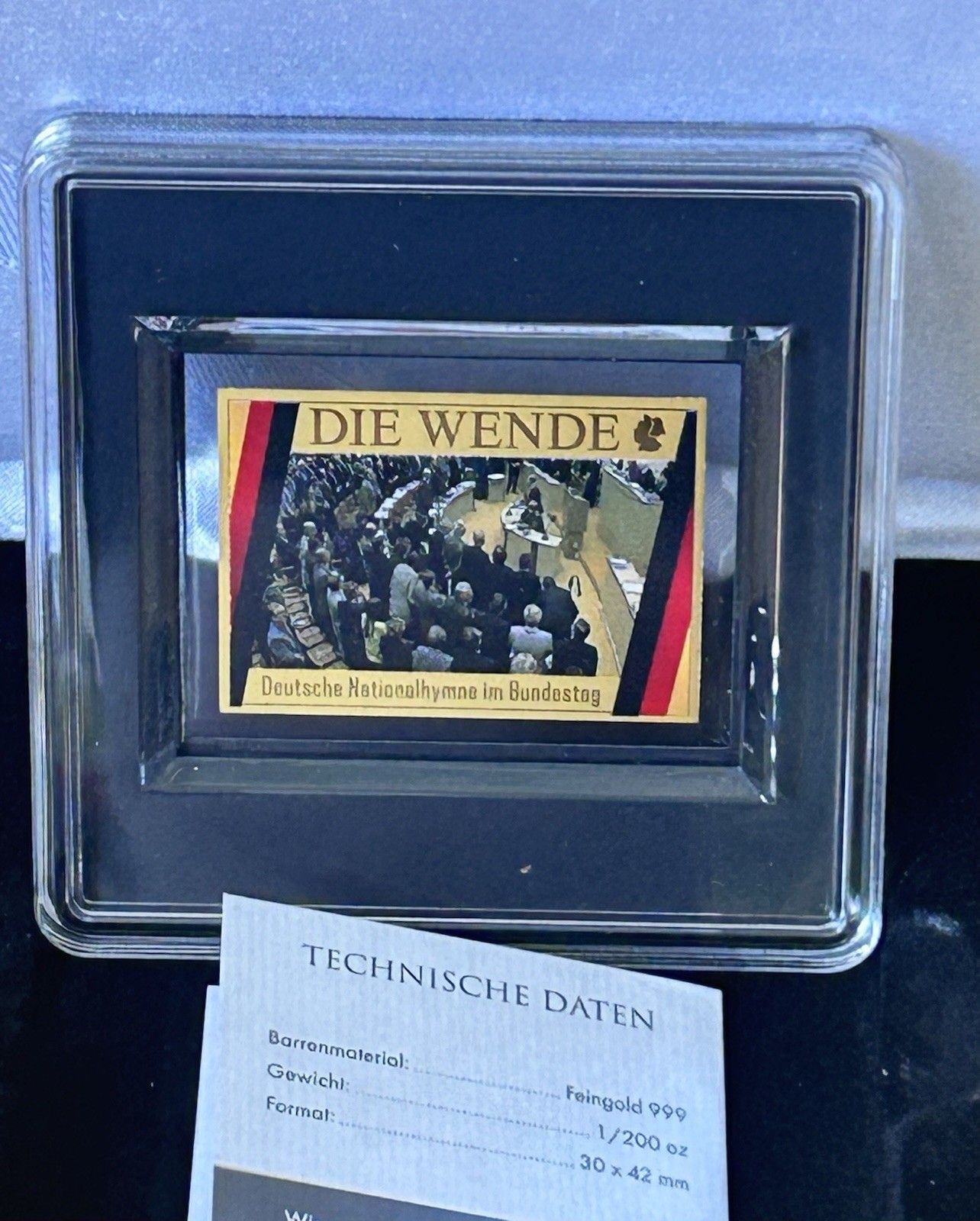 Gold BARREN 1/200 OZ Die Wende 999 Gold Münze mit Zertifikat Material: 999 Gold Gewicht: 1/200 oz Maße: 30 x 42 mm Zustand: gute Erhaltung, siehe original Bilder