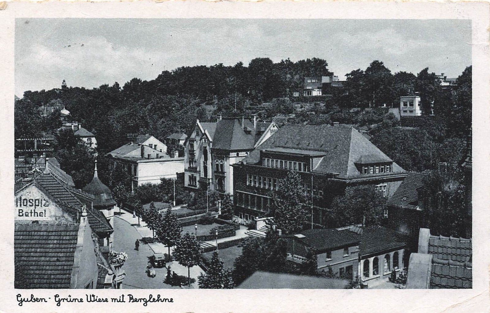 Grüne Wiese mit Berglehne und Hospiz Guben Brandenburg Postkarte AK 1942