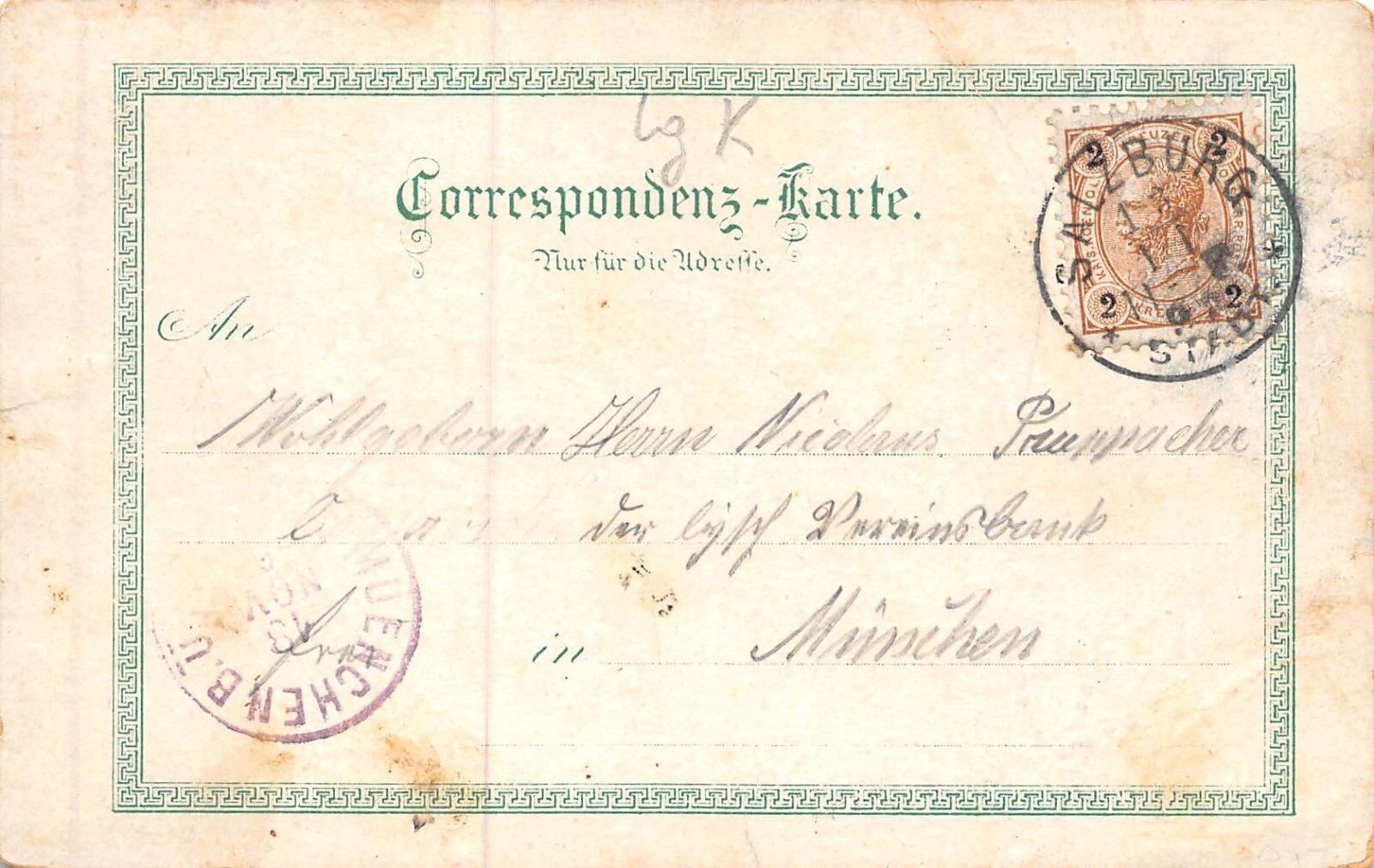 Original Postkarte Maße 9 x 14 cm Rückseite: gelaufen 1897 von Salzburg nach Muenchen Zustand: leichte Gebrauchsspuren, Knick