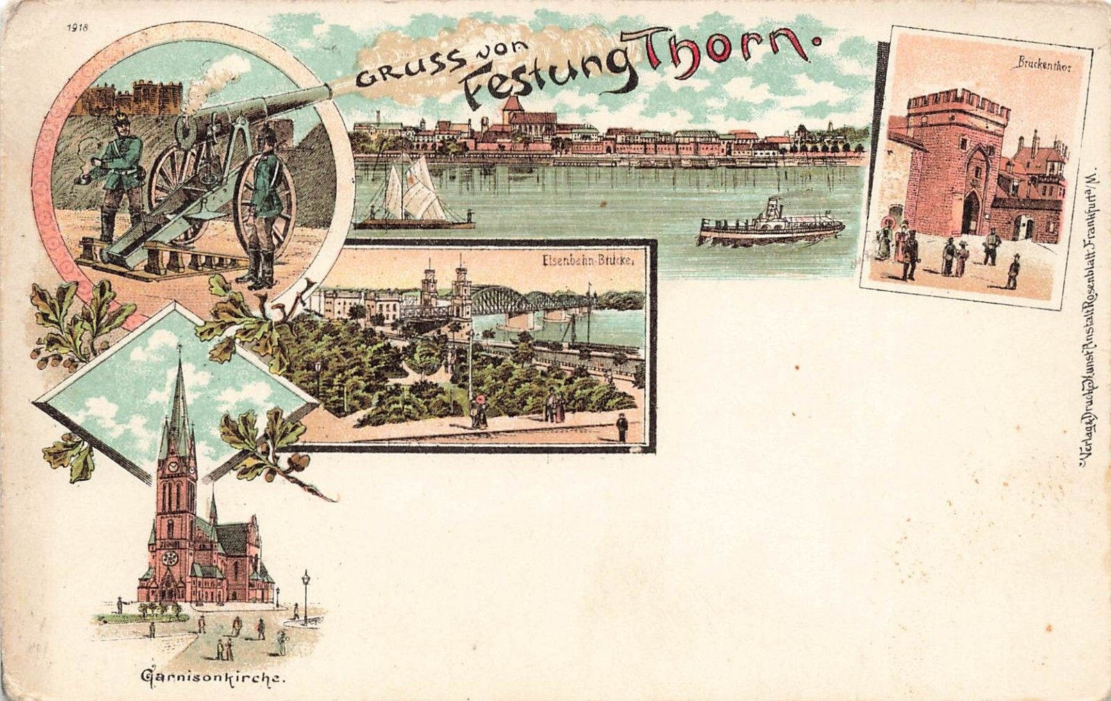 Gruss von Festung Thorn Eisenbahnbrücke und Kirche Westpreußen Postkarte AK