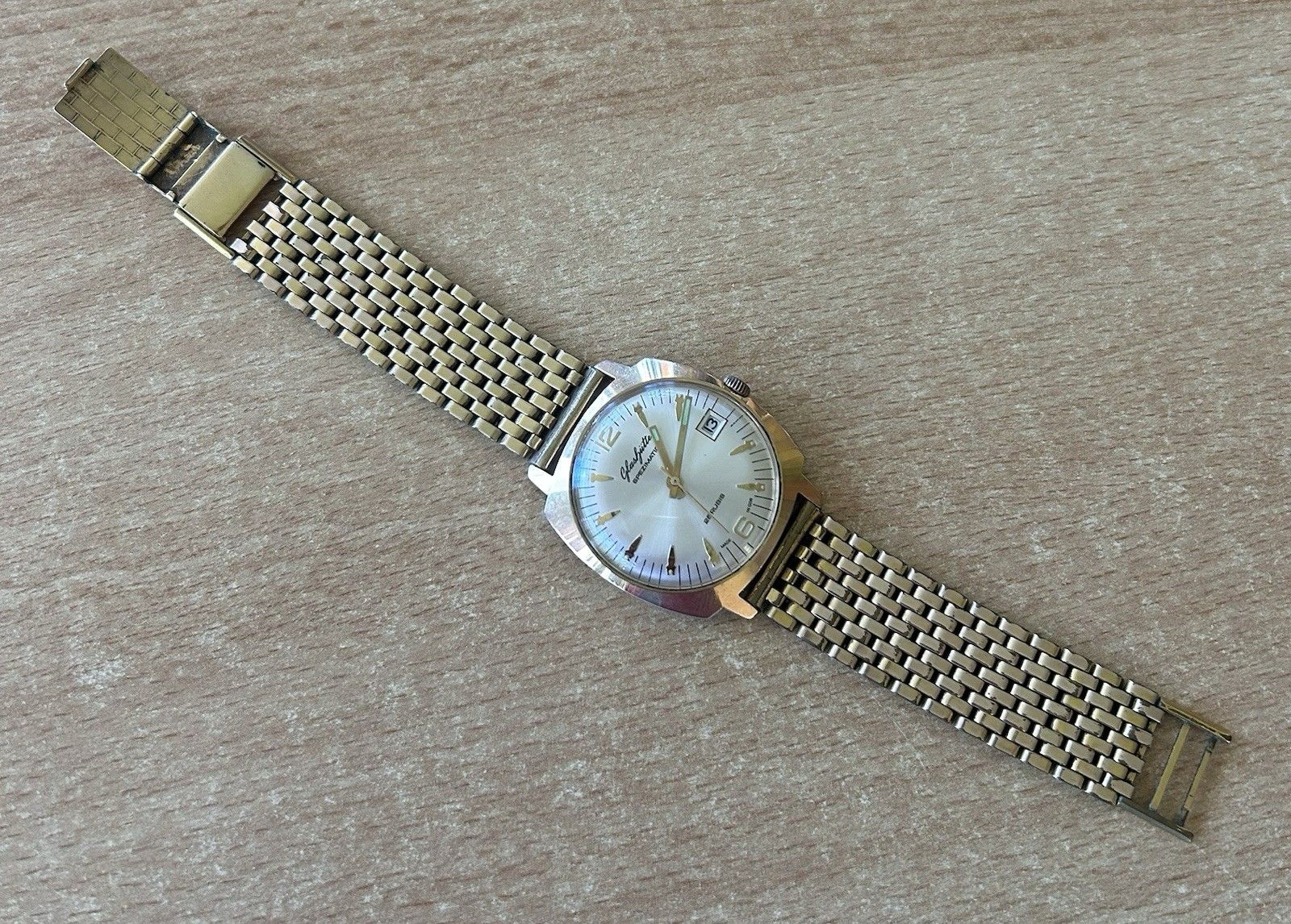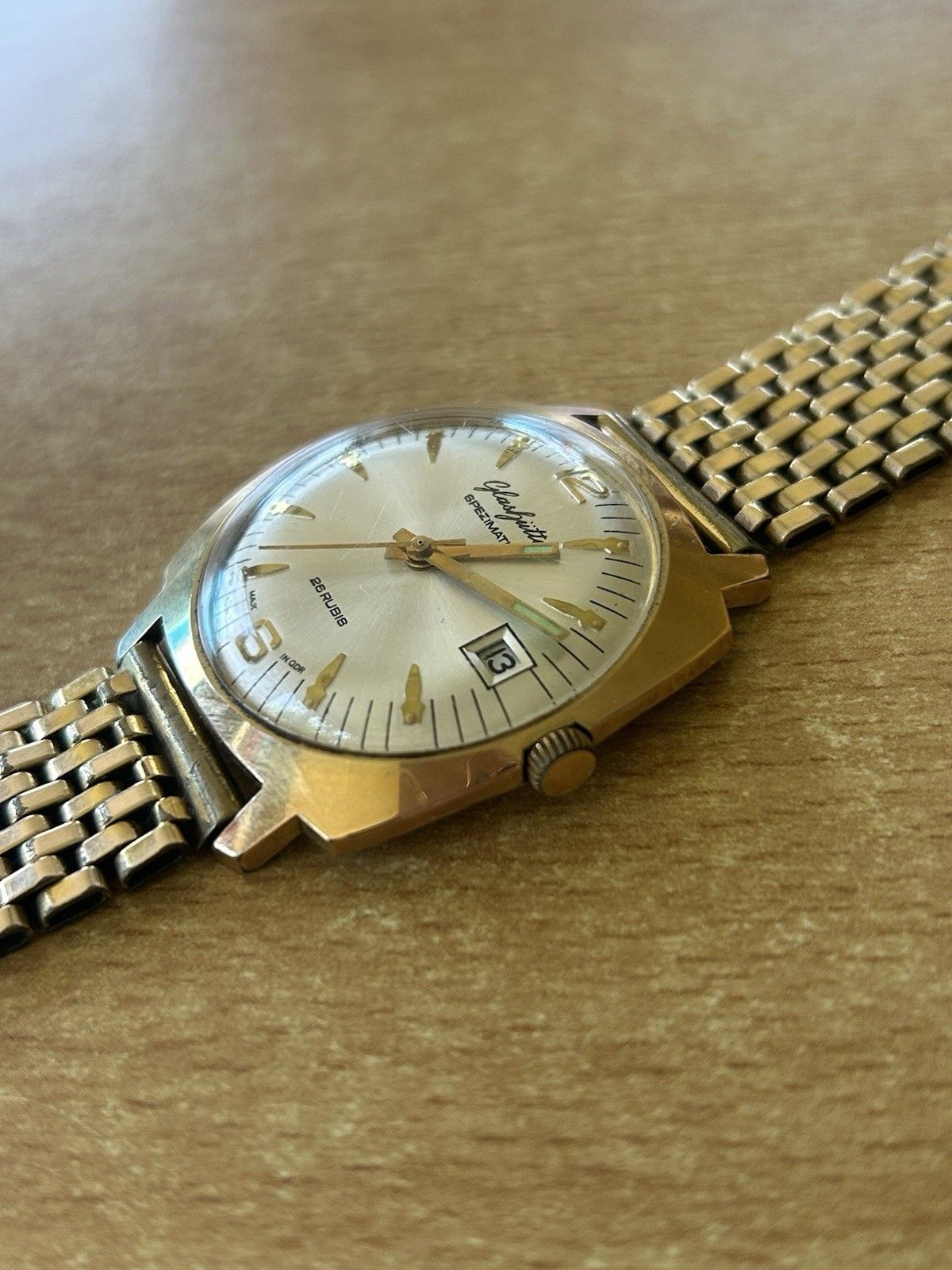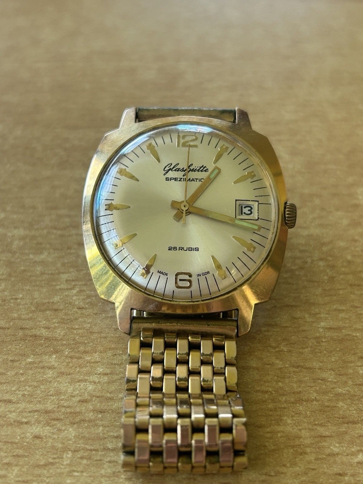 Original Herren Armbanduhr Glashütte Spezimatic mit Datumsanzeige Goldplaque 26 Rubis Mechanische Handabzug , Funktionsfähig, Durchmesser 36mm Zustand: Top Erhaltung