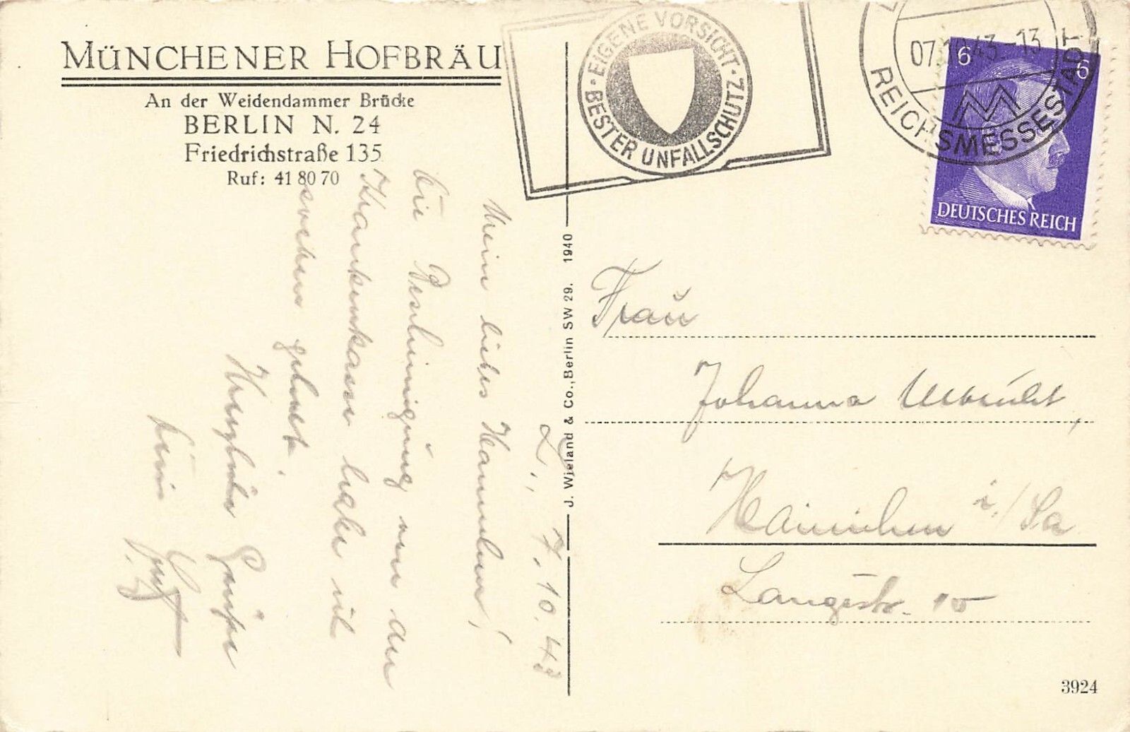Rückseite: gelaufen 1943