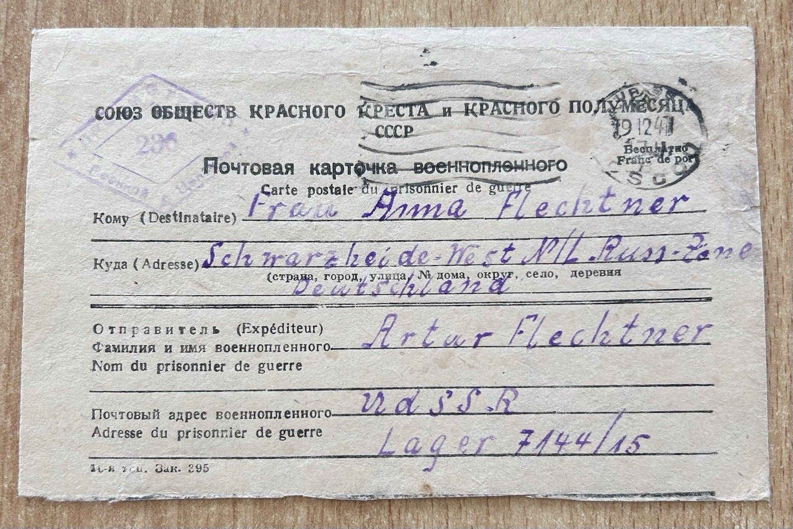 Kriegsgefangenenpost von Russland / UdSSR Rotes Kreuz nach Deutschland 3.12.1947 Lager Nr. 7144/15 Zustand: leicht gebraucht