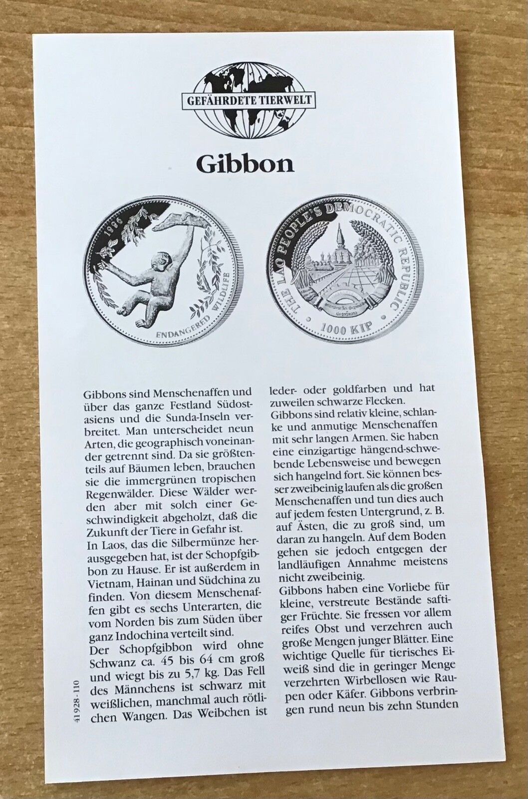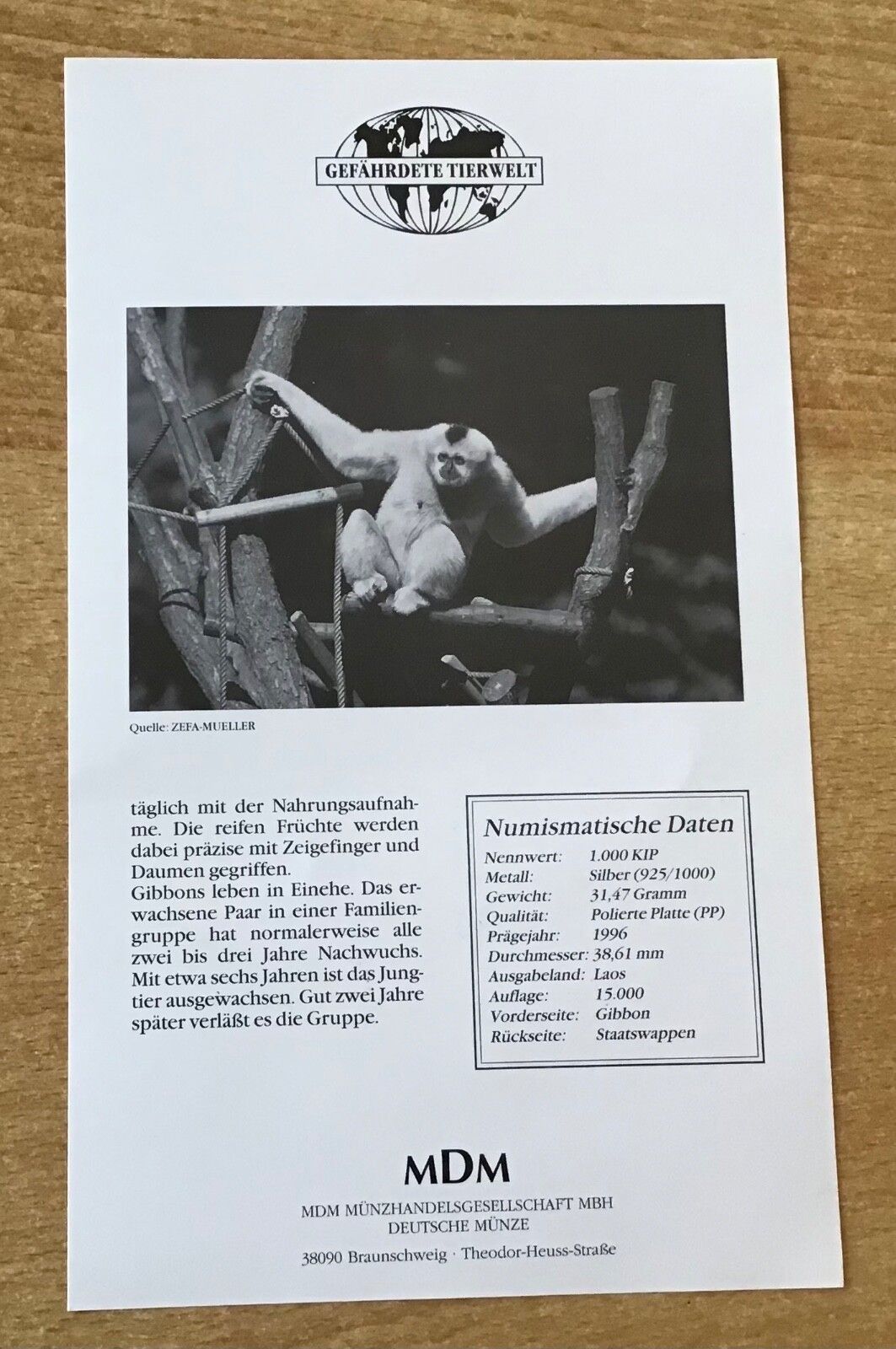 Gefährdete Tierwelt Laos 1000 KIP 1996 Silber PP mit Zertifikat Tierwelt Gibbon Metal: Silber 925 Durchmesser: 38,61 mm Gewicht: 31,47 g Zustand siehe Originalbilder Echtheit wird garantiert.