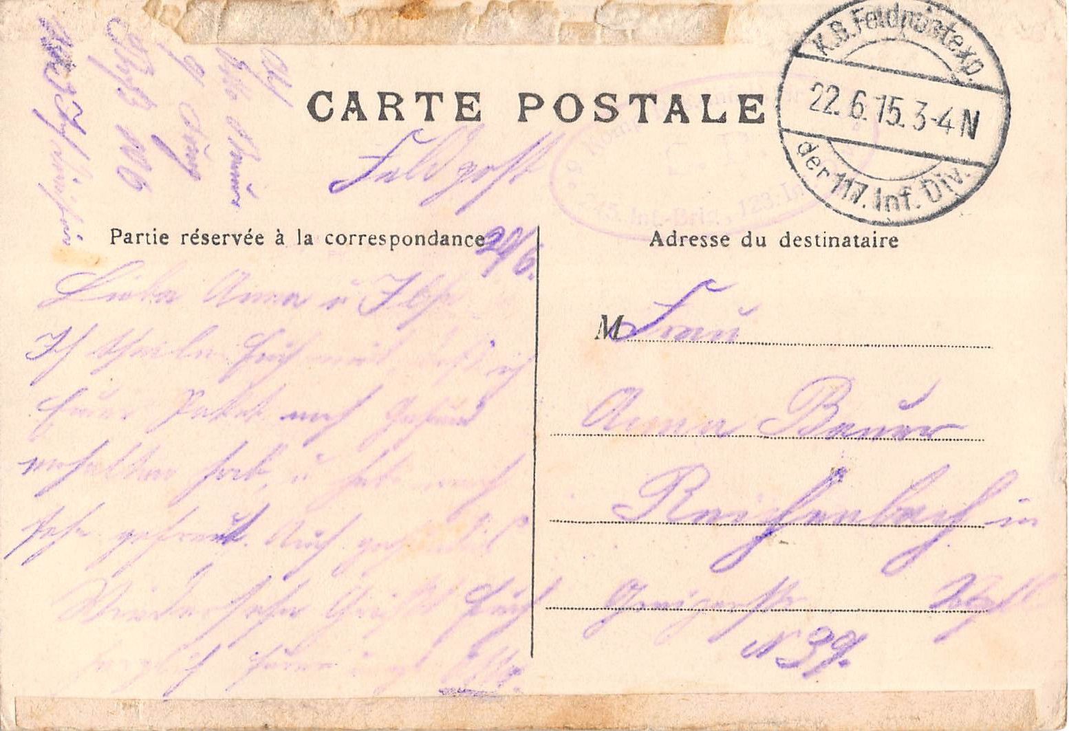 Original Feldpostkarte Maße 9 x 14 cm Rückseite: gelaufen als Feldpost 22.6.1915 der 117 Inft. Division Zustand: leicht gebrauchsspuren, klebereste