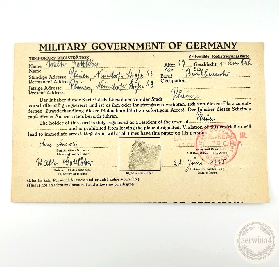 Military Government of Germany Registrierungskarte 28.06.1945 Plauen Bankbeamter