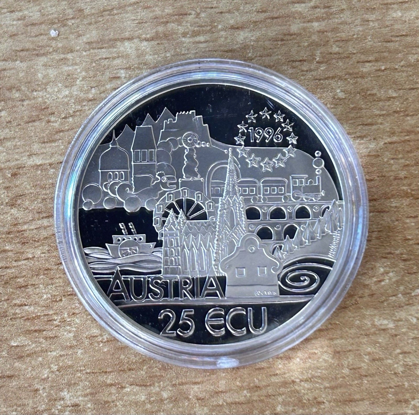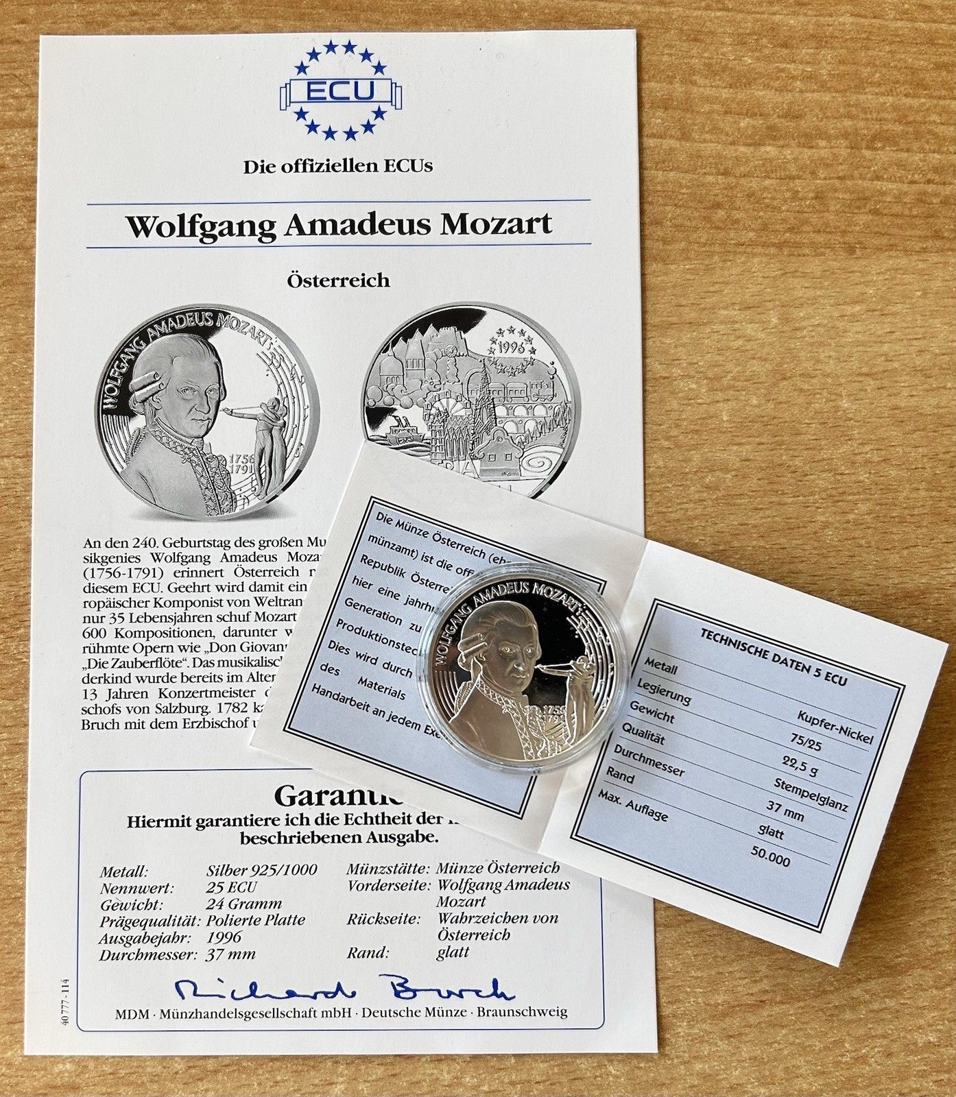 Österreich 25 ECU 1996 к" Amadeus Mozart PP Silber, Zertifikat Material: Silber 925 Gewicht: 24g Durchmesser: 37 mm Zustand siehe Originalbilder Echtheit wird garantiert.