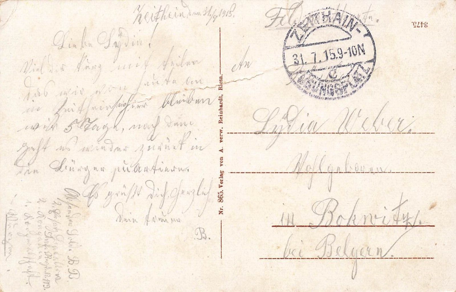 Original Postkarte Maße 9 x 14 cm Rückseite: gelaufen 1915 Zustand: Einriss (6mm), Mittel Bug, Eckknick (oben rechts)