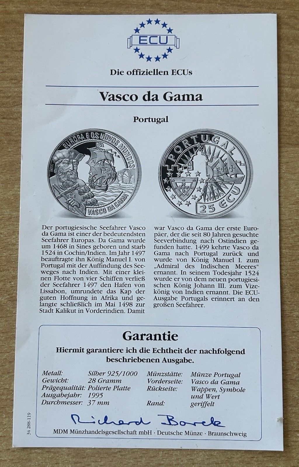 Portugal 25 ECU 1995 Vasco da Gama PP Silber , Zertifikat Material: Silber 925 Gewicht: 28gDurchmesser: 37mm Zustand siehe Originalbilder Echtheit wird garantiert.