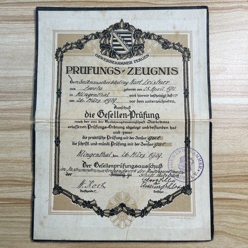 Das Prüfungszeugnis eines Saitenmacherlehrlings der Gewerbekammer Plauen aus dem Jahr 1929 ist ein beeindruckendes Stück Geschichte. Das in deutscher Sprache verfasste Dokument zeigt nicht nur die fachliche Qualifikation des Absolventen, sondern auch die Bedeutung des Handwerks zu dieser Zeit. Ein perfektes Sammlerstück für Liebhaber von Antiquitäten und historischen Dokumenten, das einen Einblick in die Handwerkskunst vergangener Zeiten bietet.
