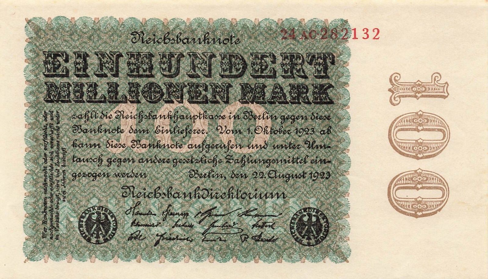 Original Reichsbanknote 100 Millionen Mark 22.8.1923 DEU-120c Zustand: Kassenfrisch/UNC