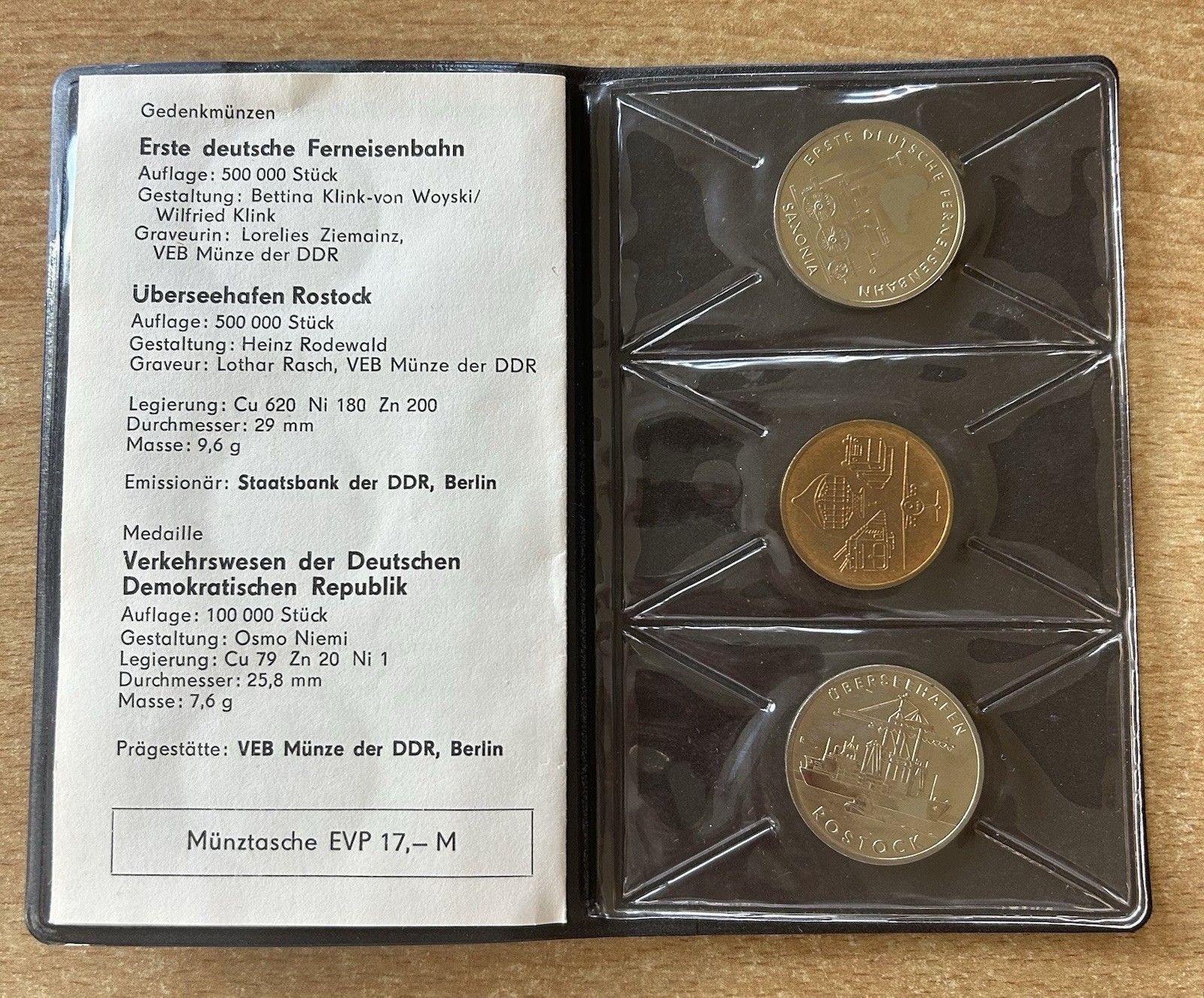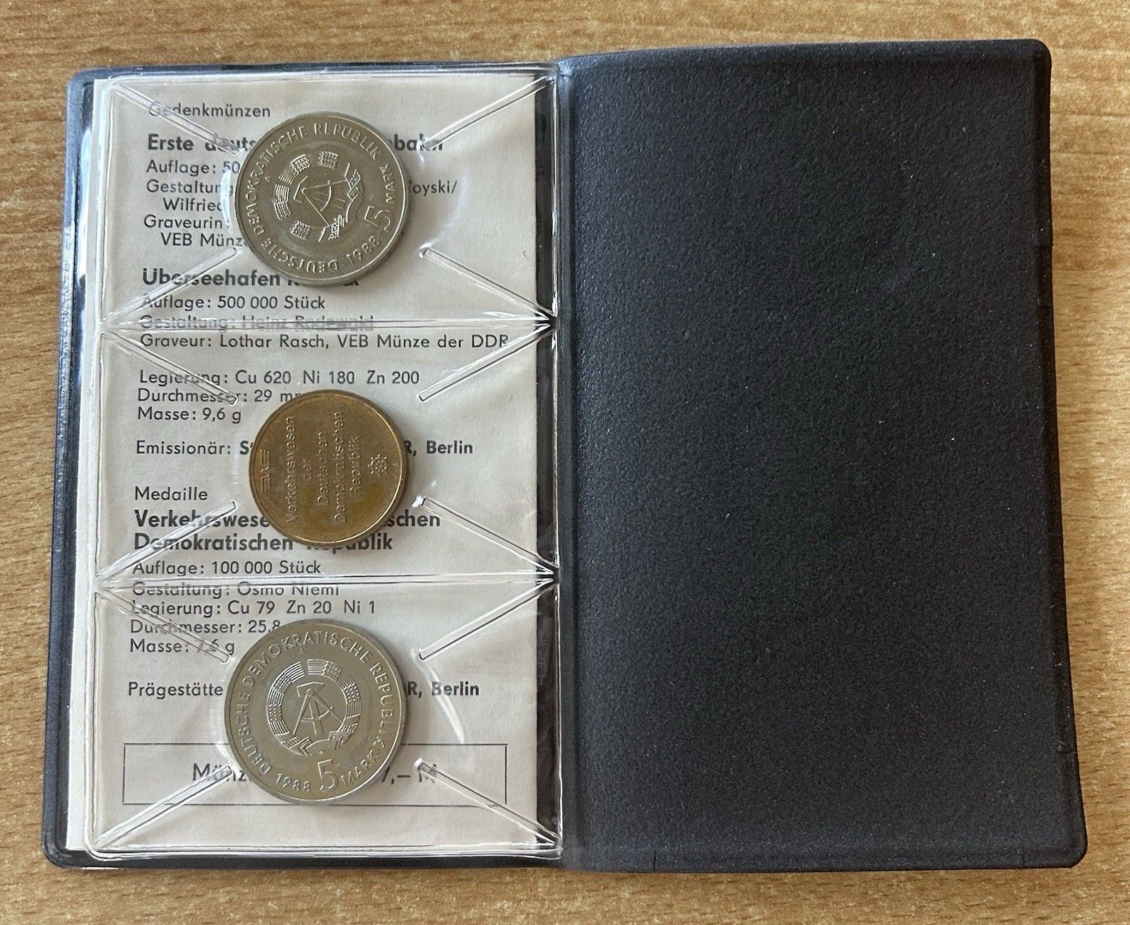 Münzmappe Verkehrswesen Staatsbank der DDR 1988 5 Mark Gedenkmünzen Ferneisenbahn, Überseefahrt Rostock und Medaille Verkehrswesen der DDR Material: Kupfer / Nickel Zustand siehe Originalbilder Echtheit wird garantiert.