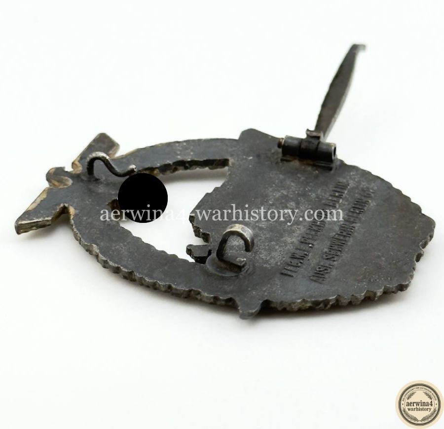 Originales Schnellboot-Kriegsabzeichen in Zinkausführung von Schwerin Berlin. Getragenes, aber gut erhaltenes Stück mit authentischer Patina. Typische materialbedingte Abnutzung. Rückseite mit gleichmäßiger Patina, Nadel original und funktionsfähig, Herstellerangabe klar lesbar.