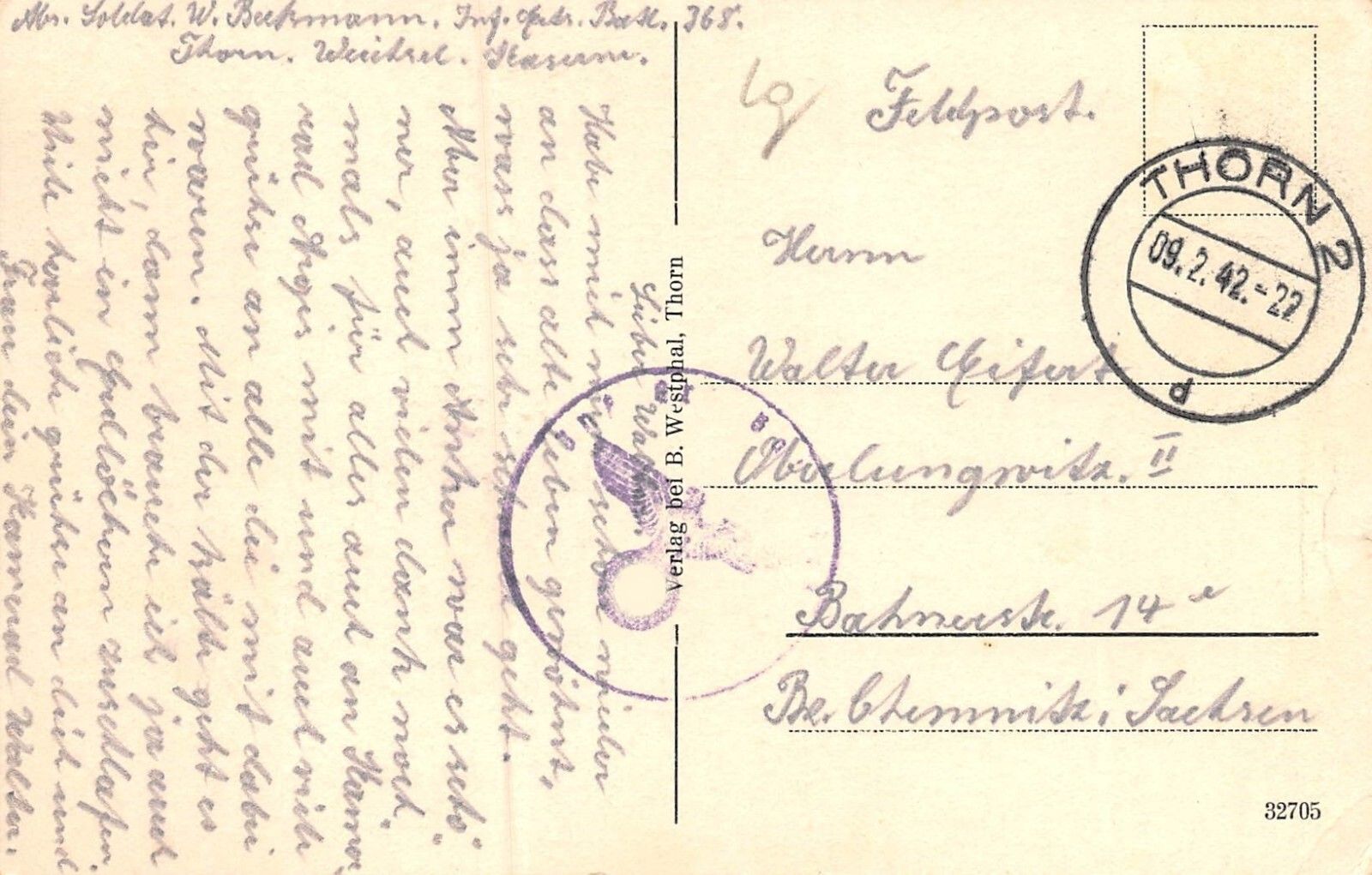 Original Postkarte Maße 9 x 14 cm Rückseite: gelaufen 1942 von Thorn Zustand: leichte Gebrauchsspuren
