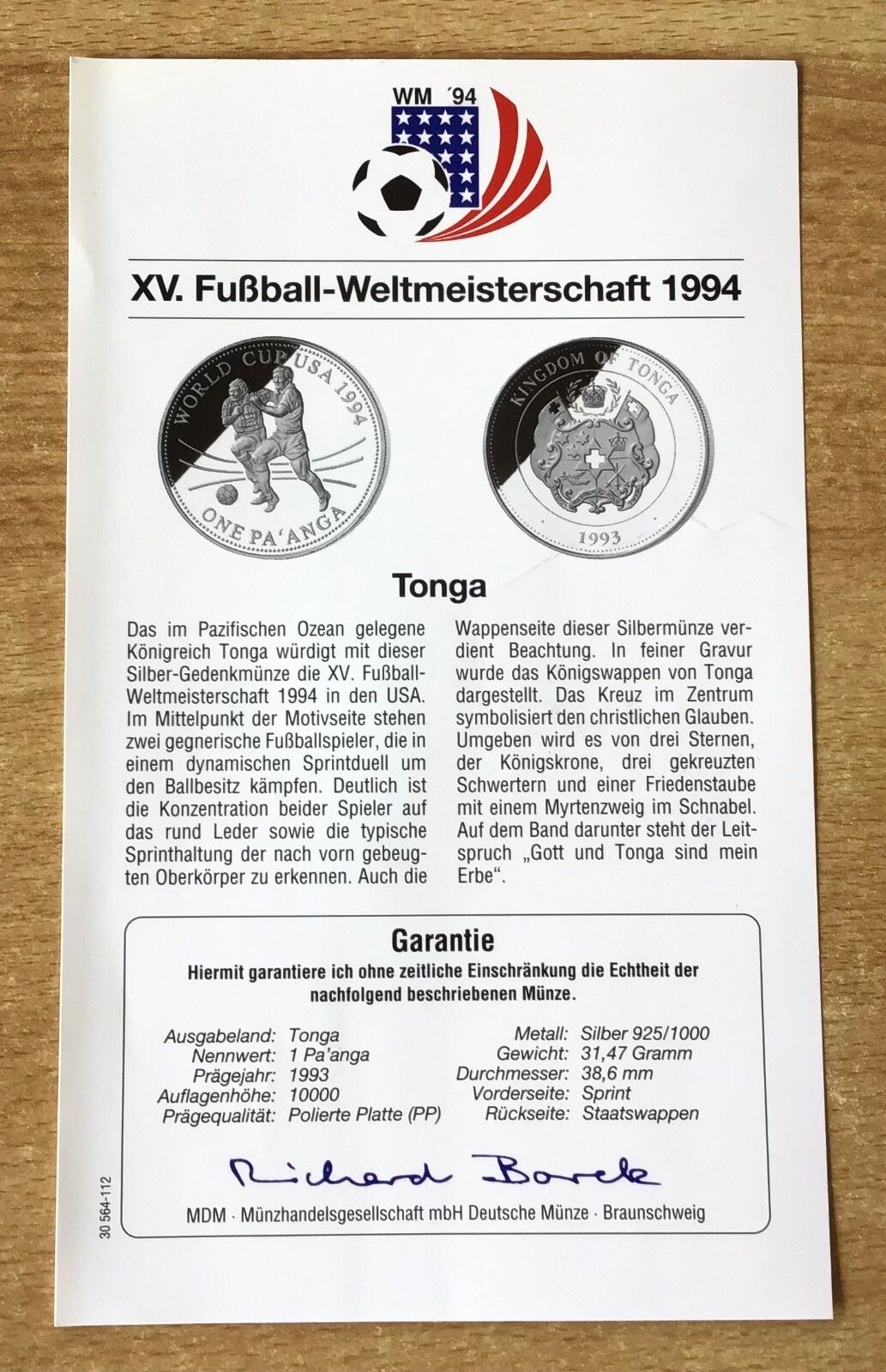 XV. Fußball - Weltmeisterschaft 1994 Tonga 1 Paanga 1993 Sprint Fußball PP Silbermünze Mit Zertifikat Material: 925 Silber Gewicht: 31,47 g Durchmesser: 38,6 mm Zustand siehe Originalbilder Echtheit wird garantiert.