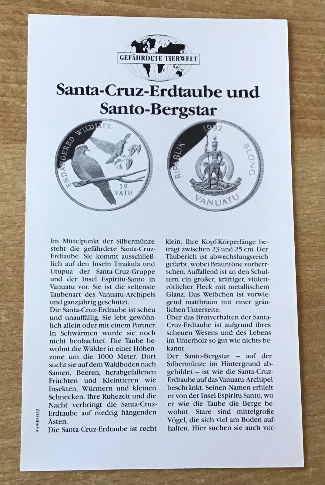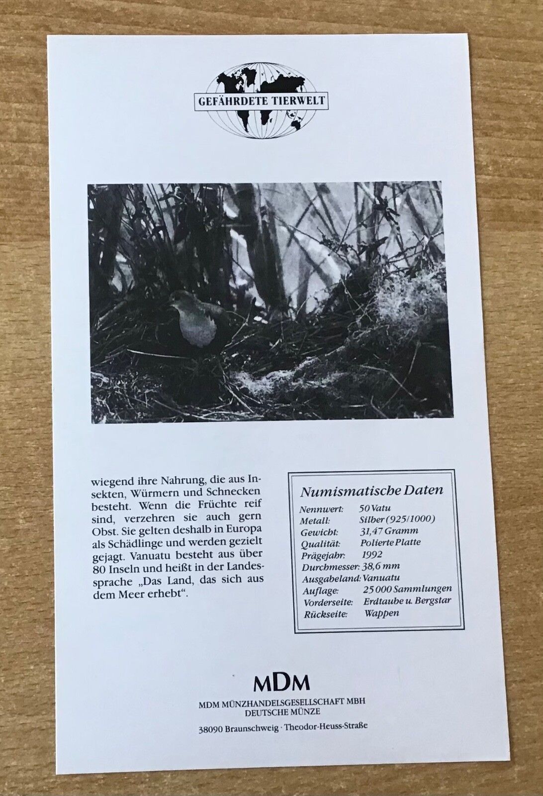 Vanuatu 50 Vatu 1992 Silber PP mit Zertifikat Tierwelt Erdtaube