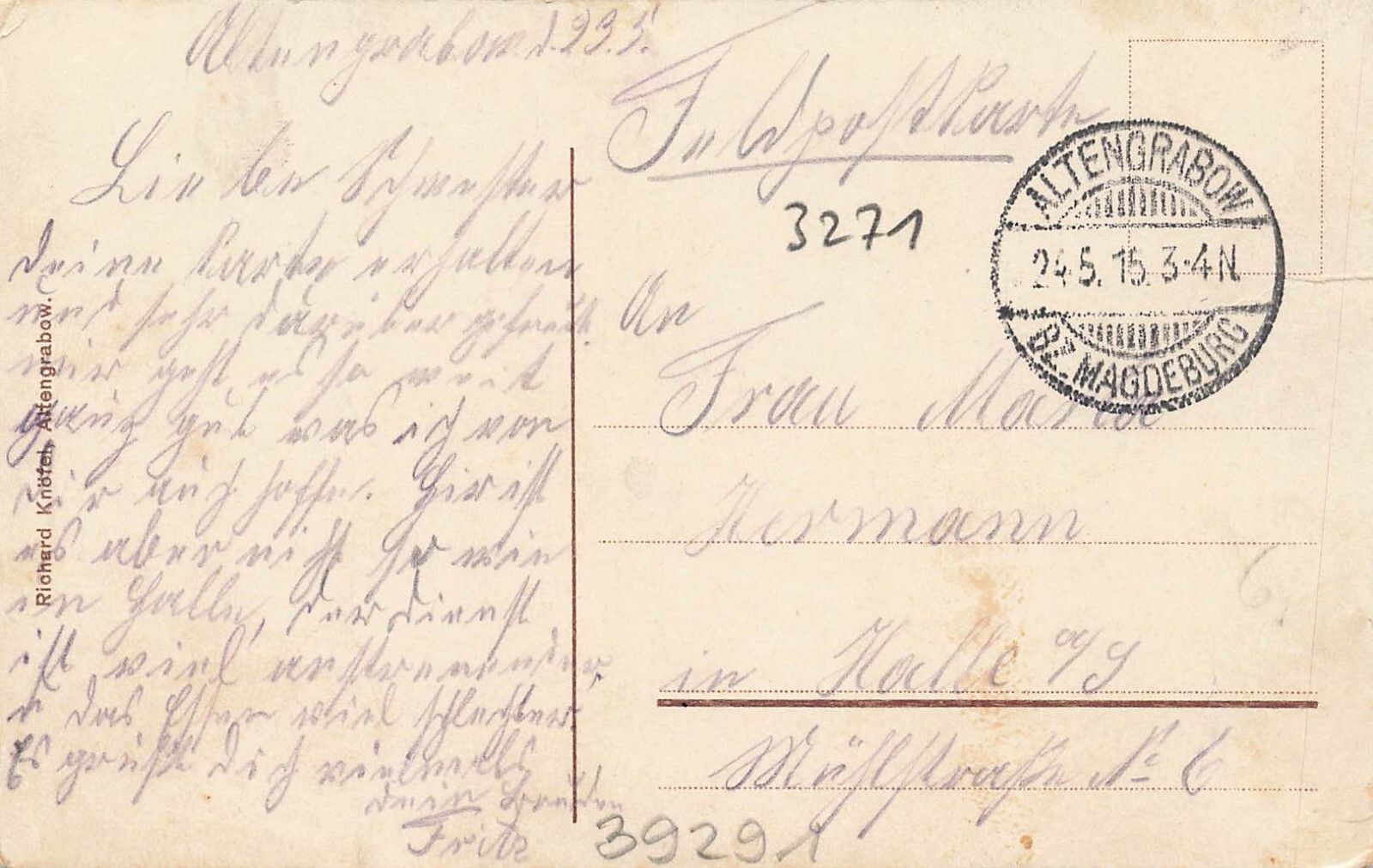 Original Postkarte Maße 9 x 14 cm Rückseite: gelaufen 1915 Zustand: leichte gebrauchsspuren, kleiner leichter Bug (Mitte links)